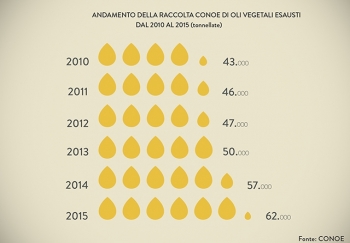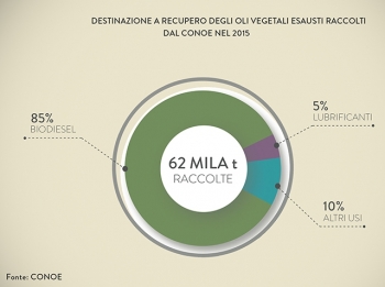 Operativo dal 2001, in questi anni il CONOE ha progressivamente incrementato la propria raccolta - che avviene prevalentemente nel settore della ristorazione - passando dalle 15mila tonnellate del 2002 alle oltre 62mila dello scorso anno, ovvero il 22% del potenziale raccoglibile che ammonta a 280mila tonnellate. L’85% degli oli vegetali esausti recuperati dal Consorzio viene avviato a rigenerazione per la produzione di biodiesel, un combustibile vegetale non tossico e completamente biodegradabile che può essere utilizzato come carburante per autotrazione in sostituzione o miscelazione di carburanti di origine fossile, riducendo il contributo di emissioni di CO2 nel settore dei trasporti. Nel 2015, grazie alle 53mila tonnellate di oli vegetali esausti rigenerate, sono state prodotte 49 tonnellate di biodiesel CONOE, consentendo un risparmio sulla bolletta energetica del Paese di 17 milioni di euro. I bilanci di Carbon footprint e Water footprint per i quantitativi di oli gestiti dal CONOE nel 2015 e avviati a produzione di biodiesel, comportano un beneficio ambientale netto per il Paese pari a 152mila tonnellate di CO2 evitate e a 63mila metri cubi di acqua risparmiati. Il restante 15% dell’olio vegetale raccolto in Italia viene invece recuperato in molteplici processi e applicazioni: come sorgente di energia rinnovabile in impianti di co-generazione, come bio-lubrificanti, come prodotti per la cosmesi, saponi industriali, inchiostri e cere.
