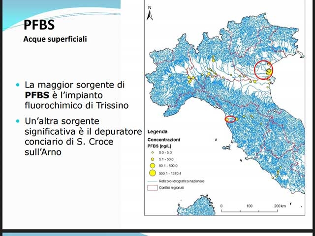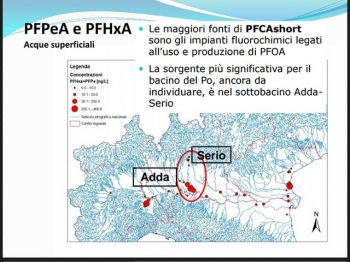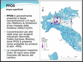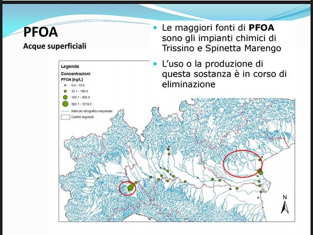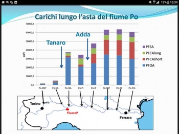 “Dallo studio Cnr – rivela l’Assessore – forme di inquinamento di questo tipo sono state rilevate in concentrazioni più alte nelle aree industriali del Bormida e nel Bacino del Lambro, oltre che, come arcinoto, in Veneto. Se l’impianto fluorochimico Trissino è la maggior sorgente individuata, un’altra sorgente significativa è l’area della concia di Santa Croce sull’Arno. Interessata è anche praticamente l’intera asta del Po, con la sorgente più significativa nel sottobacino Adda-Serio e con carichi da Torino a Ferrara. Per quanto riguarda i Pfoa, Trissino è in buona compagnia con l’area degli impianti chimici piemontesi di Spinetta Marengo”.