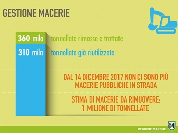 "Dal 14 dicembre 2017 non ci sono più macerie pubbliche in strada - ha sottolineato il presidente della Regione Marche, Luca Ceriscioli - e sono state rimosse e trattate 360mila tonnellate, ma la cosa più importante è che 310mila tonnellate sono state già riutilizzate. Durante i sopralluoghi in aree dove le macerie sono state completamente rimosse ci sono ancora strutture lesionate che non vanno scambiate con macerie non rimosse, perché alcune hanno il vincolo della sovraintendenza e non possono essere demolite. Per altre i proprietari vogliono riutilizzare la struttura esistente per la ricostruzione riutilizzando gli stessi materiali, pertanto questi non verranno demoliti o rimossi".
