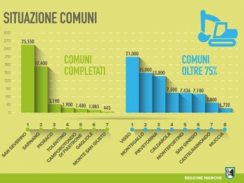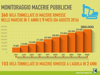 "Sette comuni marchigiani - ha proseguito il presidente - hanno completato la rimozione delle macerie e in 8 comuni sono oltre il 75% le attività di rimozione. Facendo un paragone con l'Aquila, che assomiglia come orografia al nostro territorio in due anni erano state rimosse 103mila tonnellate, mentre nelle Marche tre volte e mezzo in un anno e sei mesi. Questa è la testimonianza di un dato importante, ma occorre fare aggiornamenti periodici andando sul posto, incontrando gli amministratori e migliorando, dove necessita, i siti di raccolta macerie. E stato più che appurato che nelle macerie non c'è presenza di amianto perché viene trattato nella primissima fase e non coinvolto nei passaggi successivi. Chi ha dato l'allarme lo ha fatto in maniera totalmente infondata. La stima della macerie totali scende da un milione 150 mila tonnellate ad un milione. Restano quindi 640mila tonnellate di macerie potenziali. Da dicembre, dopo che sono state rimosse tutte le macerie in strada, vengono trattate solo quelle provenienti da demolizioni, dettate dalle ordinanze dei sindaci.