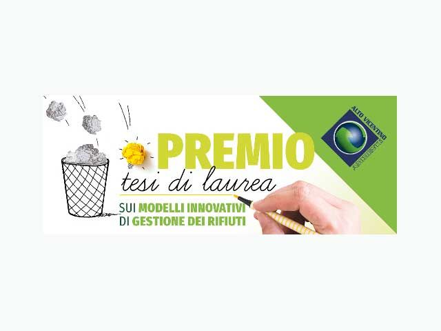Visto il successo delle prime due edizioni, Alto Vicentino Ambiente s.r.l ha indetto la terza edizione del concorso che premia le migliori tesi di laurea discusse in Italia sulla gestione innovativa dei rifiuti, in rapporto alle nuove tecnologie, ai materiali riciclabili, ai trattamenti dei rifiuti, alla valorizzazione del rifiuto nella produzione di energia, a nuove forme di gestione/efficientamento del servizio di raccolta, ai sistemi di partnership per la riduzione dei rifiuti.