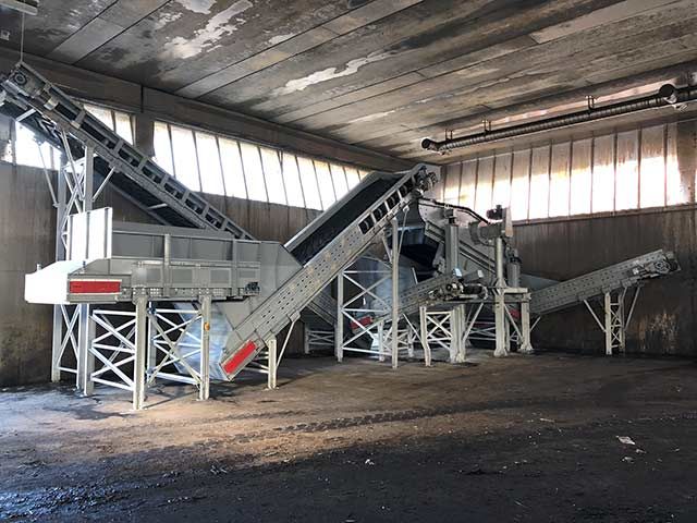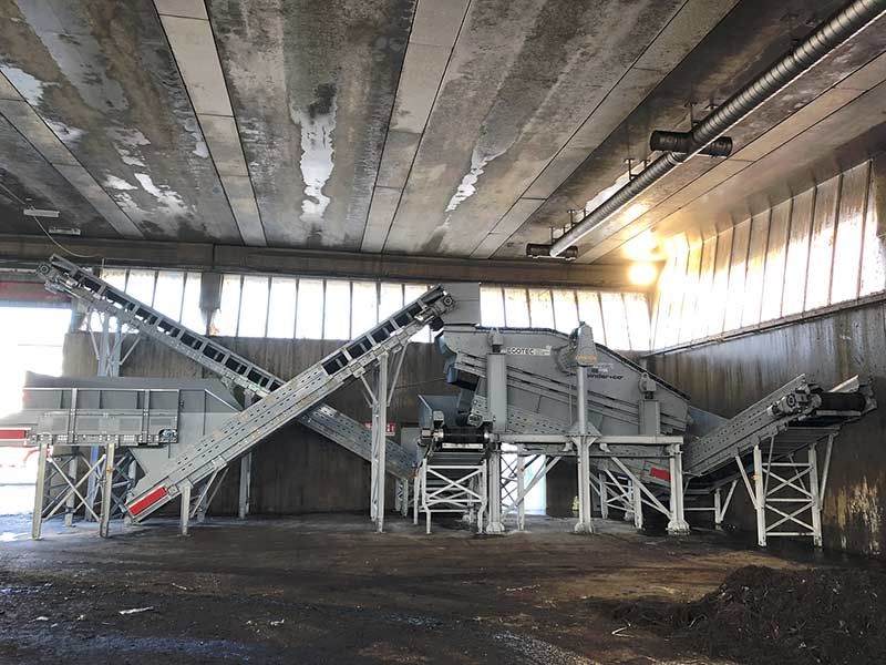 Presso questo stabilimento, all’interno di un capannone, è stato installato un vaglio flip flow Bivitec per la vagliatura primaria, in grado di trattare circa 50 t/h di materiale. La granulometria del materiale in entrata è compresa tra 0 e 150 millimetri e la sua densità è di circa 0,6 t/m3. I piani vaglianti della macchina sono dotati di fori quadrati da 60 millimetri. In questo modo il sopravaglio viene separato e viene immesso nuovamente nel processo di maturazione mentre il sottovaglio, di dimensione uguale o inferiore ai 60 millimetri, prosegue verso la fase successiva del processo: la raffinazione.