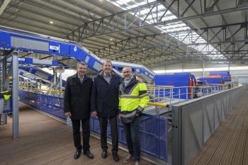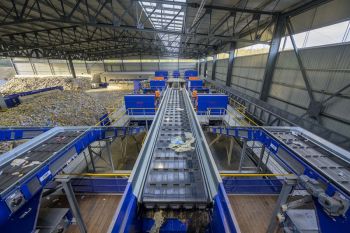 The multi-material plant takes in the whole 15-tonne/hour input, which is fed into a STADLER PPK ballistic separator and two STADLER STT2000-8-1 ballistic separators for mechanical sorting. This is followed by optical separation with four Near-Infrared (NIR) devices, and the process is completed with manual sorting. The final output fractions of this line are PCNC (packaging and small cardboard fractions), cardboard, film and JRM (newspapers, journals, magazines), as well as hollow materials which are then fed into the plant’s second sorting line.