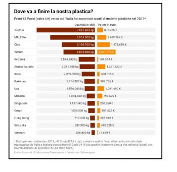 Così, a seguito del bando cinese, altri Stati, pur non essendo dotati di sistemi idonei ed efficaci di recupero e trattamento, sono diventati le nuove mete dei rifiuti globali. Tra questi, la Malesia è stata il primo importatore di rifiuti plastici italiani nel 2018 e, dato confermato anche nei primi nove mesi del 2019, resta tuttora partner privilegiato dell’Italia, garantendosi il secondo posto con 7 mila tonnellate importate tra spedizioni dirette e indirette, per un valore di quasi un milione e mezzo di euro.