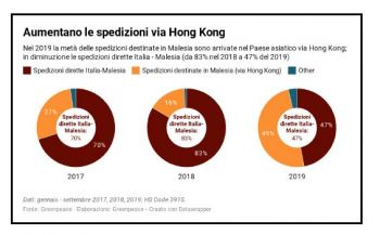 Inoltre Greenpeace denuncia che, pur essendo diminuite le spedizioni complessive verso la Malesia, nel 2019 si è registrato un importante aumento delle spedizioni che arrivano in Malesia con l'intermediazione di broker di Paesi terzi. Nel dettaglio, mentre nel biennio 2017-2018 circa il 20 per cento dei rifiuti plastici esportati dall’Italia verso il Paese asiatico era gestito da aziende non malesi (soprattutto con sede a Hong Kong e in minima parte Cina), da gennaio 2019 cresce il ruolo degli intermediari di Hong Kong, che arrivano a gestire la metà delle nostre spedizioni verso la Malesia.