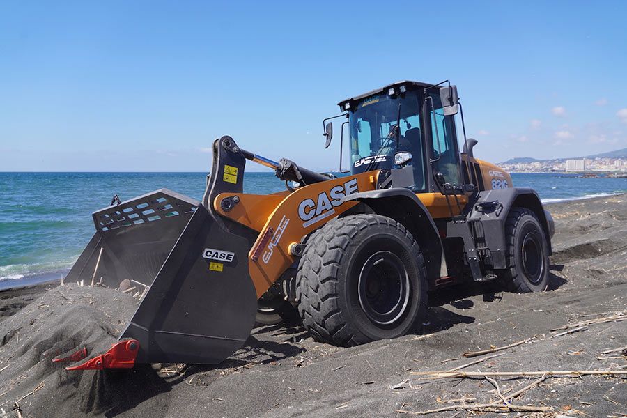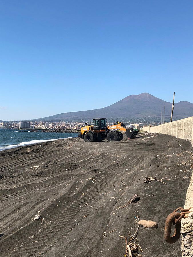 La pala gommata 821G di CASE, specializzata nelle operazioni di pulizia arenili grazie alla benna skeleton da 3 metri cubi, provvista di lamelle che consentono di drenare la sabbia e depositare i rifiuti nella benna, ha fatto il resto, consentendo di ripulire in profondità la spiaggia. I rifiuti raccolti sono stati depositati in un cassone lungo 6 m che a fine operazione è stato riempito per oltre la metà. E la sabbia finissima e nera di origine vulcanica è tornata a riavere il suo posto al sole e a restituire a Torre Annunziata la sua spiaggia.