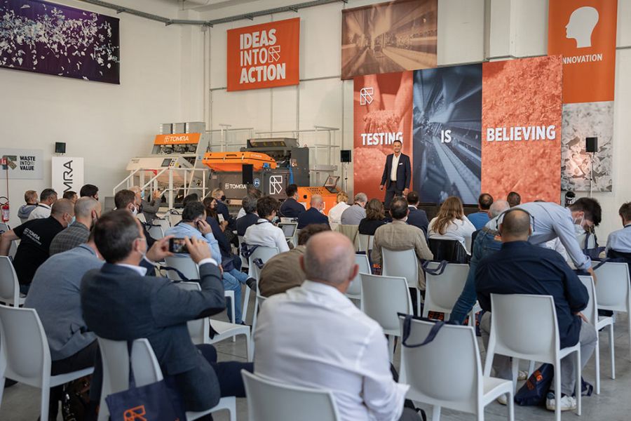 Under the theme of “Testing is believing,” TOMRA representatives welcomed about 100 participants to its exclusive opening event and guided tour of the new flake sorting facility, located next to its office in Parma, Italy. The inspiring afternoon was filled with informative presentations and demos highlighting the company’s long-term plastics strategy, the purpose and goal of the new facility, and the numerous advantages it offers customers.