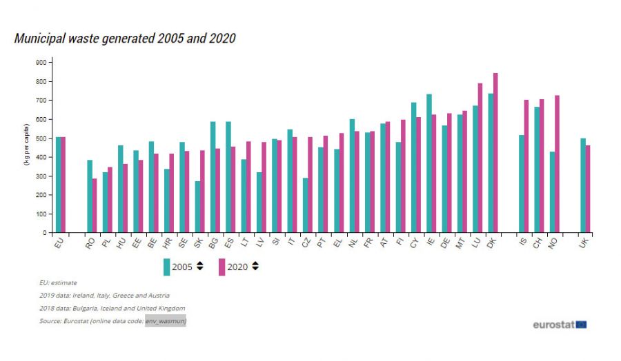 Municipal waste generation varied considerably among the EU Member States. In 2020, Denmark and Luxembourg were the highest generators of municipal waste, with 845 kg and 790 kg per capita, respectively, followed by Malta (643 kg) and Germany (632 kg).