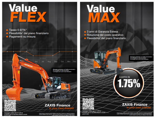 Iniziata l’1.11.2024 con chiusura il 31.3.2025, la campagna ZAXIS Finance prevede tre due pacchetti in vigore su stock di prodotti selezionati, disponibili fino a esaurimento scorte: Value Max e Value Flex. Value Max propone un leasing a tasso fisso (a partire da 1,75%) in 36 mesi con periodicità mensile e assicura tre anni di garanzia estesa, mentre con Value Flex, come sottolinea il nome, si può optare per un tasso da 0.97% che grazie alla flessibilità del piano finanziario incontra le esigenze del flusso di cassa delle aziende. Con Zaxis Finance, Hitachi Construction Machinery garantisce alle aziende l’opportunità di non dover rinunciare ai grandi progetti di crescita ed espansione sul mercato.