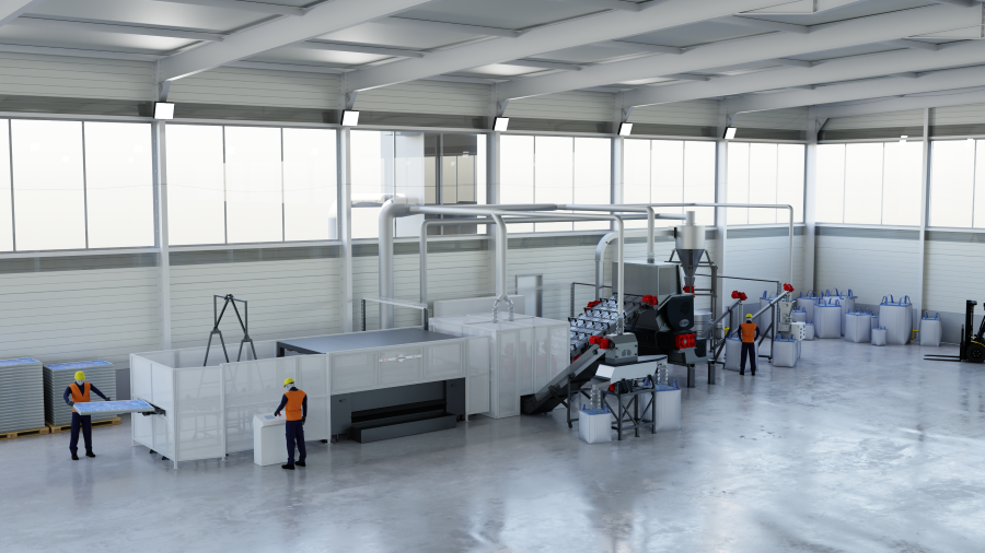 Nonostante le dimensioni compatte – 30 metri di lunghezza, 4,5 di larghezza e 3,5 di altezza – la linea è in grado di trattare fino a 60 pannelli l’ora, equivalenti a circa 1.800 kg di materiale, con un consumo medio di soli 170 kW. Questo dato, inferiore del 40% rispetto agli standard di mercato, rende Horizon uno degli impianti più efficienti in termini energetici e più vantaggiosi sul piano operativo.