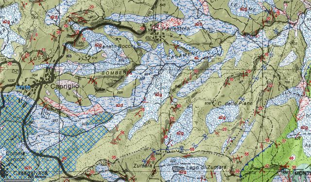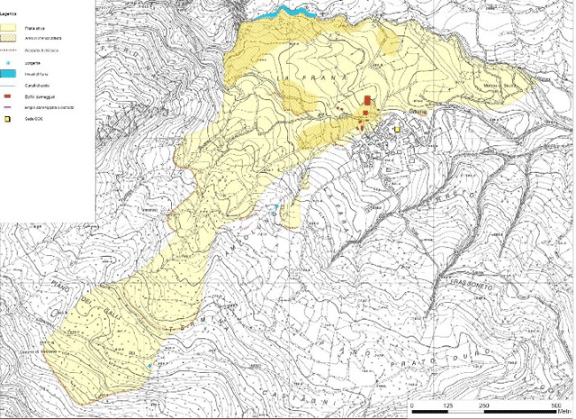 The area of landslide in very wide and is delimeted by Capriglio, Pianestolla and the toe is located in Bardea valley: in picture 4 is in red color. The rate of movement is 20 m/d. Capriglio’s landslide is a complex fall with a prevalence of earth flow.